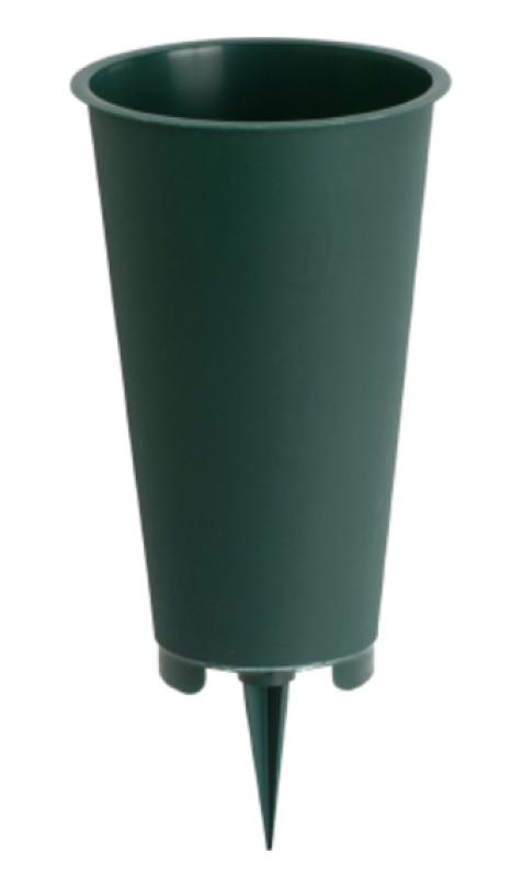 Green plastic cemetery vase with smooth sides, flat bottom and removable, locking 3" stem.