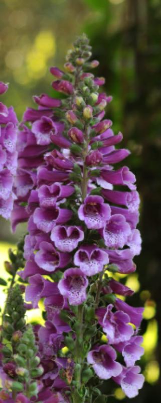 Digitalis 'Dalmatian Purple' is a variety of foxglove known for its compact size, upright spikes of purple, outward-facing flowers with dark, spotted throats, and early bloom time. This deer-resistant perennial attracts pollinators like hummingbirds and butterflies, thrives in full sun to partial shade in zones 4-9, and prefers rich, moist soil. It's a popular choice for borders, containers, and cut flower arrangements, though it is highly toxic and should be kept away from children and pets.
