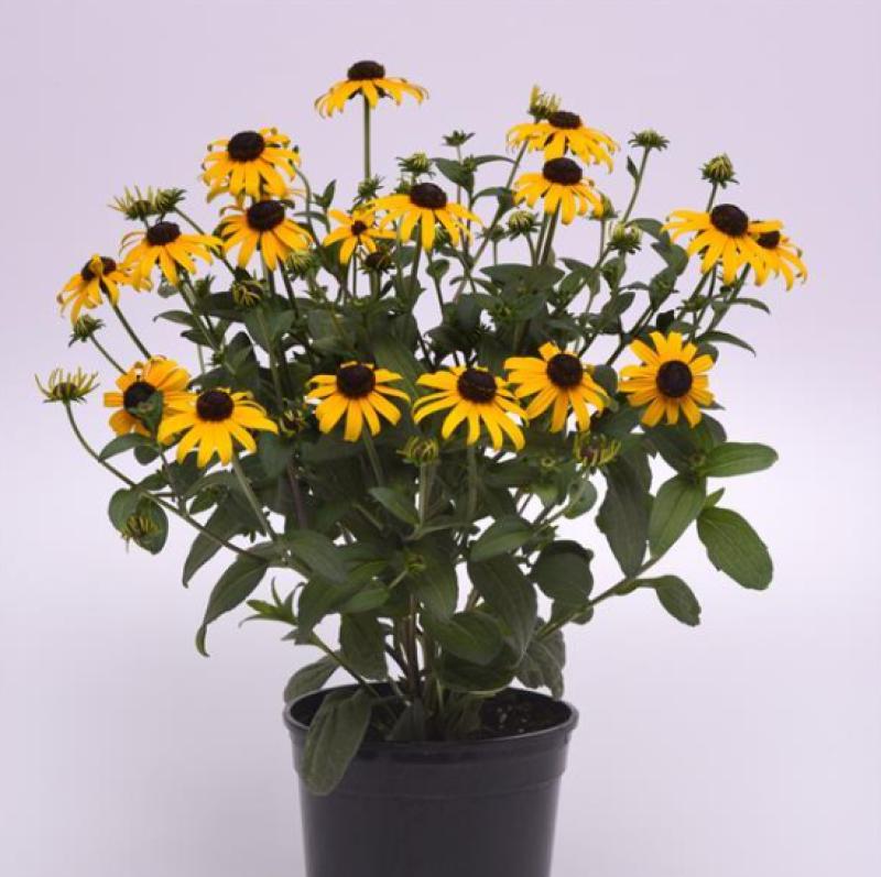 Strong, low-maintenance variety for borders and landscapes. Plants have tight foliage with shiny, dark green leaves that hold back weeds and flower abundantly from summer well into fall. Golden yellow horizontal petals contrast nicely with the black center disc.