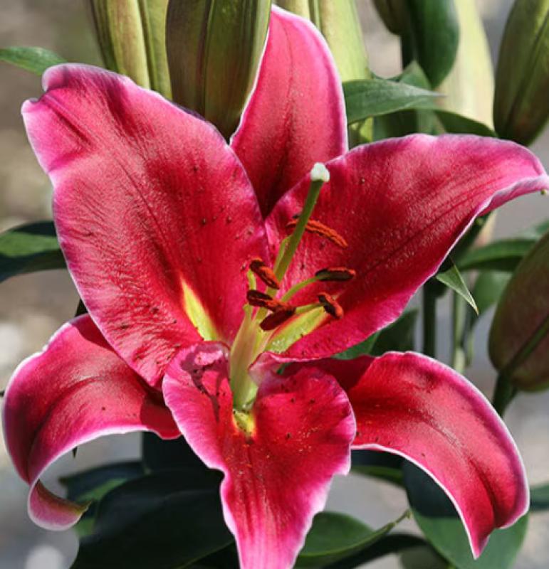 Lilium X 'Love Story,' a perennial Oriental Lily variety, known for its garden allure. This cultivar enchants with its large, fragrant, magenta pink flowers adorned with bold white edges. 'Love Story' boasts an upright growth habit, typically reaching a height of about 24-36 inches, making it an ideal choice for borders, cut flower arrangements, or as a focal point. The plant's dark green, lance-shaped foliage provides an attractive backdrop to the blooms. Renowned for its resilience and adaptability, Oriental Lily thrives in full sun to partial shade and well-drained soil.