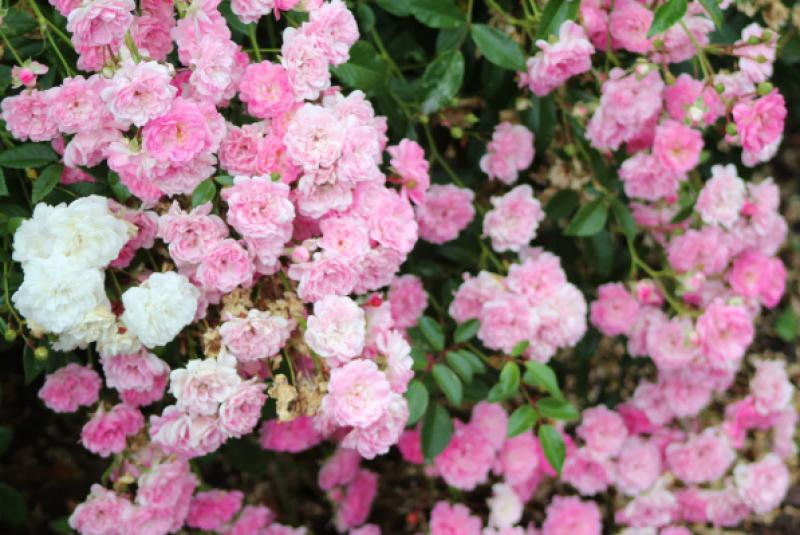 'The Fairy' has a lush, spreading shape that will soften any angle. The small, bright green, shiny leaves and the clustered sprays of little, very double pink roses are on display throughout the growing season, although Summer sun fades the flowers to blush white. Massed to create a statement or allowed to gracefully cascade over the edge of flower beds, this rose will be treasured for its versatility. This is one of the best summer blooming roses.