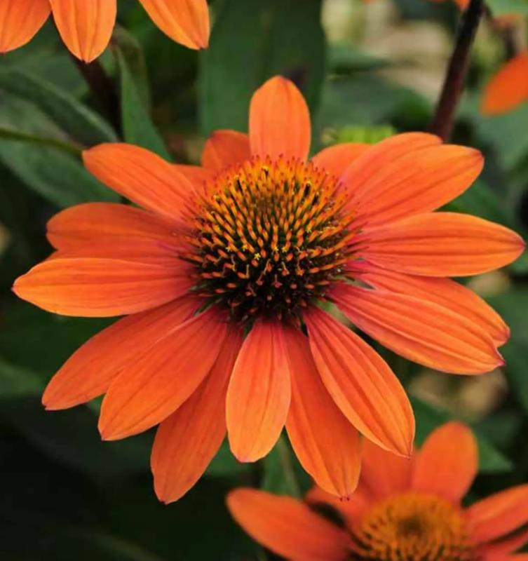 Toasty orange flowers with orange-bronzed cones don the warm hues of the western desert at sunset. Newly emerging flowers are vibrant orange. Prolific early flowering on strong stems; they complement yellow, blue and purple flowers. Long blooming! Echinacea Adobe Orange from the Sombrero® Series is valued for its super bloom power and well-branched, compact habit.