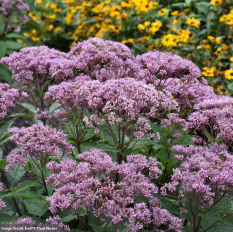 Euphoriaâ„¢ Ruby is a cultivar of Joe Pye Weed (Eupatorium purpureum), a perennial plant known for its late-summer-to-early-fall blooms of fragrant, ruby-red to pink flower clusters. This compact variety is bred for smaller gardens and features strong stems with attractive, serrated, dark green leaves. It is a magnet for pollinators like butterflies and provides seeds for birds, thrives in full sun to partial shade, and is hardy in USDA zones 4-9.