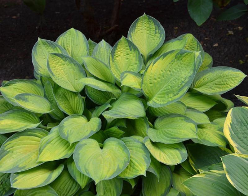 Hosta 'Guacamole' is an award-winning, fast-growing perennial known for its large, oval, chartreuse-yellow leaves with dark green margins, resembling guacamole. It produces fragrant, trumpet-shaped white-to-lavender flowers in late summer and prefers part-shade to full shade, thriving in moist, well-drained soil. This popular variety is suitable for borders, containers, and provides excellent foliage for shade gardens, but is susceptible to slugs and deer.