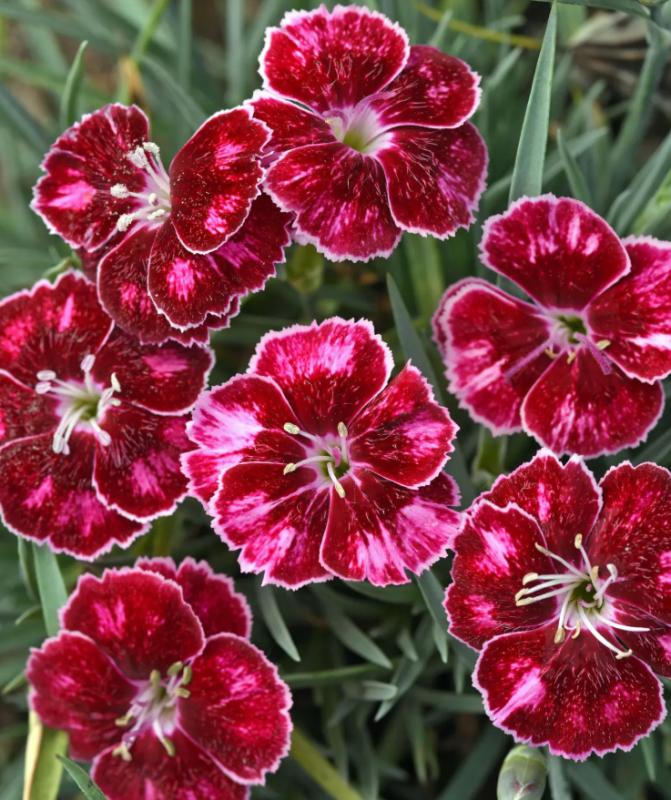 Random patches, streaks, and dots of pink to creamy white paint the deep velvety-red, single flowers. The icy silver-green foliage is a lovely contrast to the prolific flowers. Foliage may remain evergreen in warmer zones. Long-blooming from late spring into fall. Clove-scented blossoms of Dianthus Mountain Frost Ruby Glitter make stunning nosegays in your favorite bud vase. Pinks, the ultimate cottage flower is a versatile perennial at home in mixed borders, containers, butterfly, heirloom, and cutting gardens.