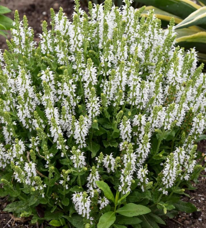 The pure white flowers of Salvia Bumblesnow glow against deep green foliage. Entire spires open from top to bottom at the same time for an attractive show. A pollinator favorite, bumblebees supply soothing garden sounds as butterflies dance to their humming. Meadow Sage is a tried-and-true perennial great for novice gardeners. Perfect for dried or cut flower arrangements.