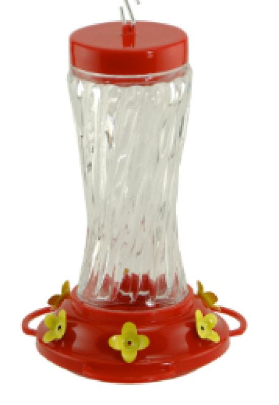 Made of beautiful swirl glass bottle. 3 perches and 6 small flower feeding stations provide ample space for many birds. Easy to fill and clean with twist off base.