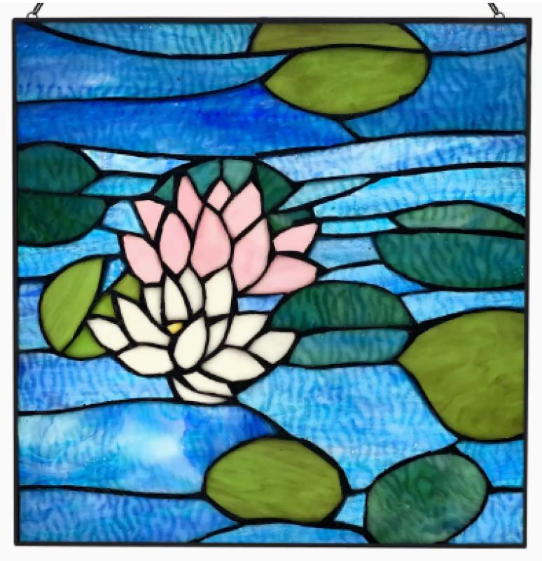 This lovely nature-inspired stained glass window panel showcases two lotus flowers floating in a pond. Crafted from 72 textured Tiffany-style glass cuts, it makes the perfect addition to your kitchen, living room or bedroom — anywhere you've got a sunny window that will let natural light filter through. Simply hang it with the included 24" metal link chain and watch your space fill with a colorful kaleidoscope of light.
