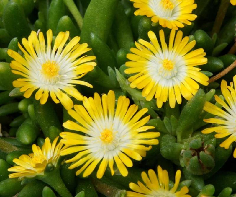 A gorgeous ground-covering solution for your driest, sunniest spots, Jewel of Desert Peridot Ice Plant (Delosperma) is a long-blooming perennial that shines in two-toned color from late spring until early fall. Bright yellow blossoms with white centers cover the succulent green foliage. This plant will thrive as long as conditions are dry. Peridot is great for waterwise rock gardens, green roofs, and attractive erosion control. (Delosperma)