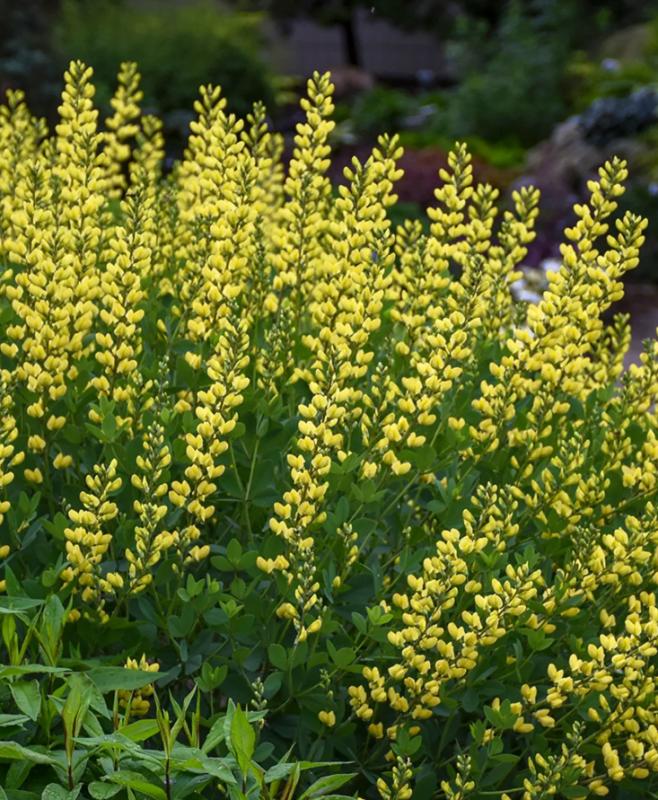 Prolific, upright flower spikes support pea-like yellow flowers above a dense, wide habit. Like their precious songbird namesakes, the glowing torches of yellow won’t be overlooked. Large, round seed pods follow the flowers to add interest to the fall/winter garden. Baptisia American Goldfinch thrives with little maintenance. False Indigo is very long-lived once established. The foliage does die back to the ground completely each winter; however, the mature plants provide a shrub-like appearance and provide a lovely backdrop to any summer or fall garden.