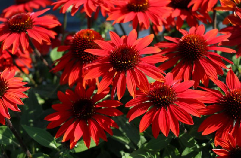 Orange flowers mature to warm red. Dark central cones. Rich, dark green leaves. Drought Tolerant, Salt Tolerant