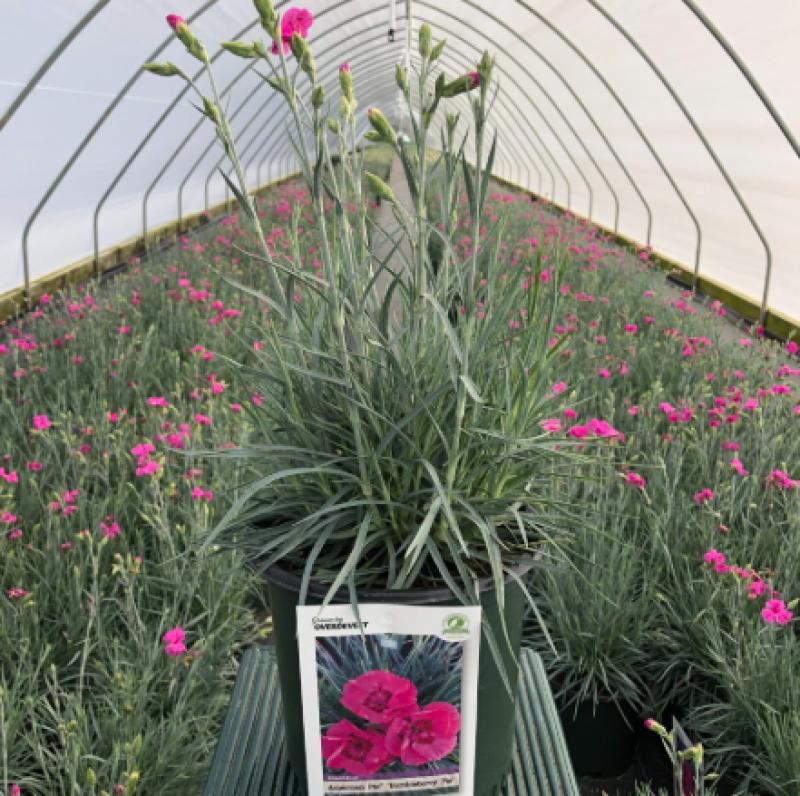Dianthus 'Bumbleberry Pie' is a fragrant, compact perennial from the Whetman® American Pie® Collection, known for its vibrant rose-pink flowers with a distinctive magenta or deep red center, resembling its namesake dessert. It features silvery-blue, grassy foliage, thrives in full sun and well-drained soil, and is prized for its cold and drought tolerance, making it a low-maintenance choice for borders, containers, and cut flower arrangements.