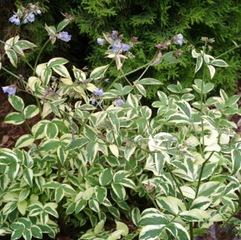 Polemonium 'Stairway to Heaven' is a variegated Jacob's Ladder, a low-maintenance perennial prized for its fern-like leaves with creamy-white margins, tinged with pink in cooler weather, and its light blue to lavender, bell-shaped flowers that appear in late spring to mid-summer. This plant thrives in full sun to partial shade, preferring moist, well-drained soil, and is excellent for brightening shaded areas, edging paths, or as ground cover. After flowering, cutting back the flower stalks to the base encourages reblooming and tidies the plant, making it a reliable and attractive addition to the garden.