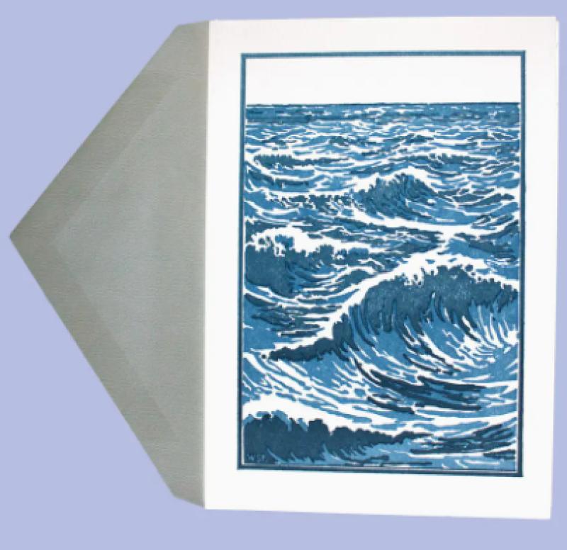Dynamic blue-on-cream ocean waves in classic Arts & Crafts style. Hand-fed letterpress printing on heavy-weight textured paper with natural deckle edges creates a luxury tactile experience. Works for sympathy, encouragement, congratulations, or appreciation.