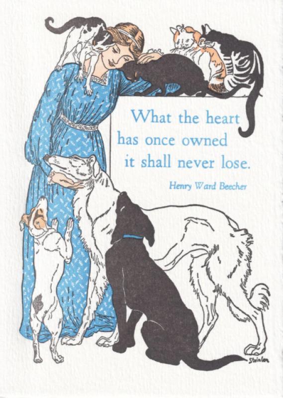 Features a serene illustration of a woman surrounded by her cherished pets and includes the heartfelt Henry Ward Beecher quote: "What the heart has one owned it shall never lose." High quality letterpress-printed card on textured paper, and comes with a ocordinating envelope.