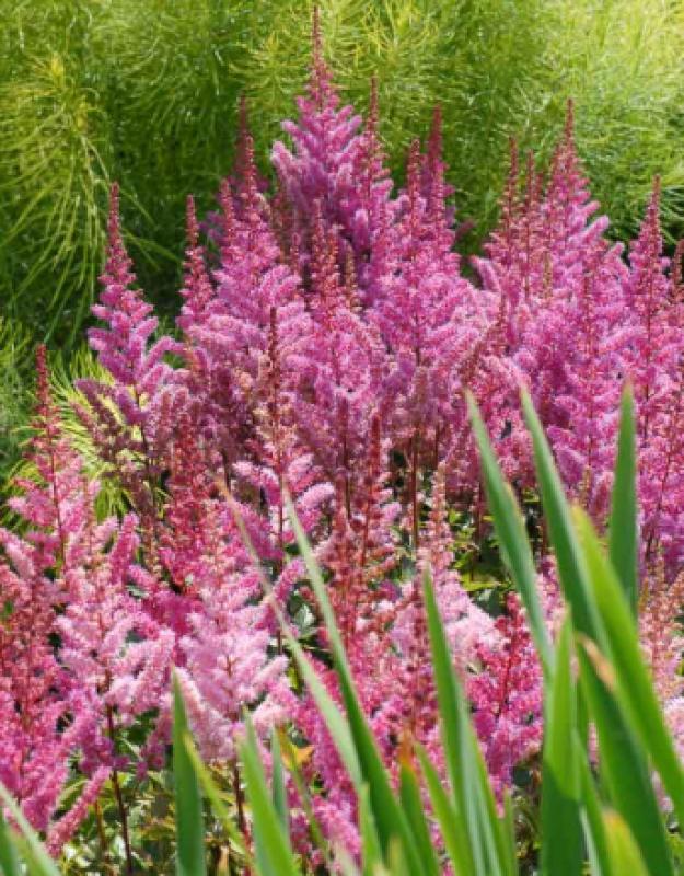 Astilbe 'Maggie Daley' is a Chinese Astilbe cultivar known for its fluffy, vivid pink to lavender-pink plumes that bloom in mid to late summer. This attractive perennial features dark green, fern-like foliage and is a hardy, low-maintenance choice for shady borders and woodland gardens. It prefers consistently moist, well-draining soil, and is resistant to deer and rabbits.