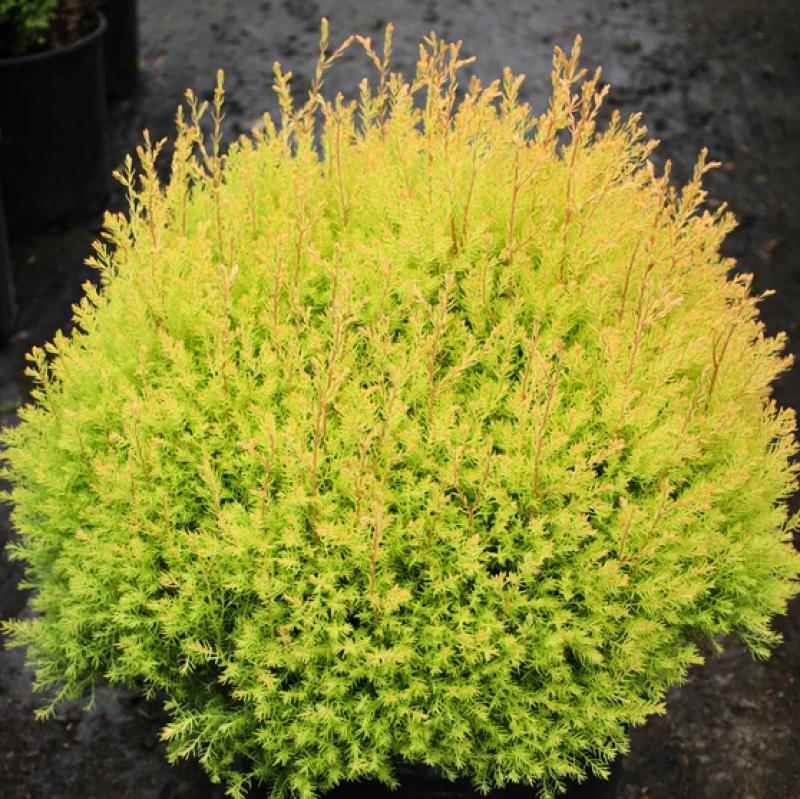 Rheingold Arborvitae (Thuja occidentalis) is a dwarf evergreen shrub that, unlike other dwarf arborvitaes, offers an unusual golden foliage color. It looks fantastic as a foundation plant, only reaching a maximum of 5 feet tall. While it can grow in partial shade, full sun will provide you with the best color. Juvenile foliage appears brighter but darkens as it matures.