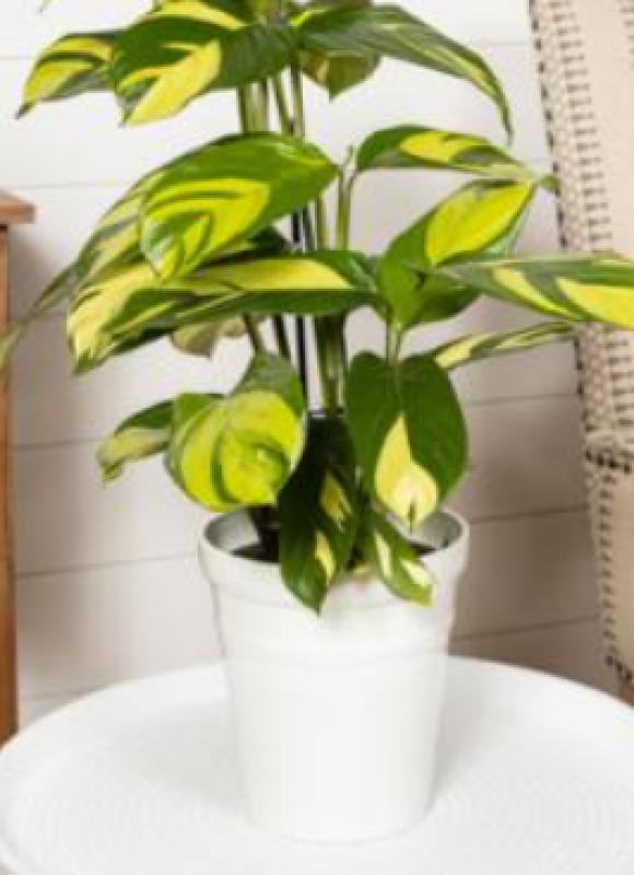 Here’s a ctenanthe or never never plant, that will transport you to ‘NeverLand!’ Dreamy, elliptical-shaped leaves grow on bamboo-like shoots. Leaves are smooth & green with flashes of golden variegation–almost as if they have been sprinkled with Tinkerbell’s stardust. By day, the fantastical leaves on this upright, clumping plant, turn down to bask in the sun’s glow; at night, however, they fold up like other varieties in the prayer plant family.