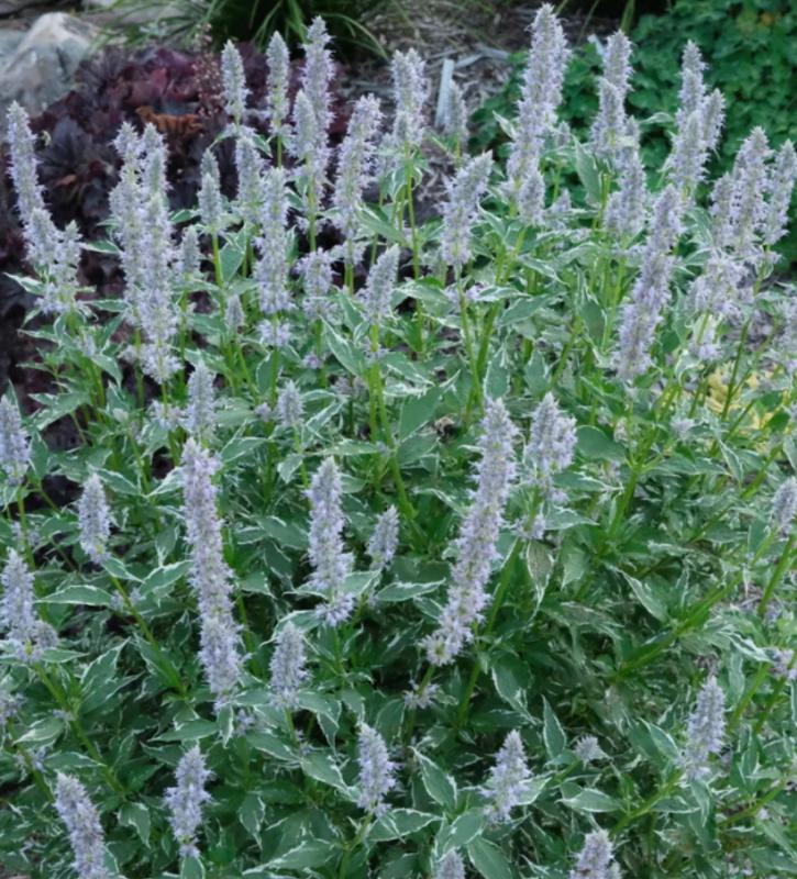 Agastache 'Crazy Fortune' has deliciously anise-scented variegated leaves, which are dark green, highlighted by a central band of greyish/light green, with a narrow string-like irregular white streak between the two colors.