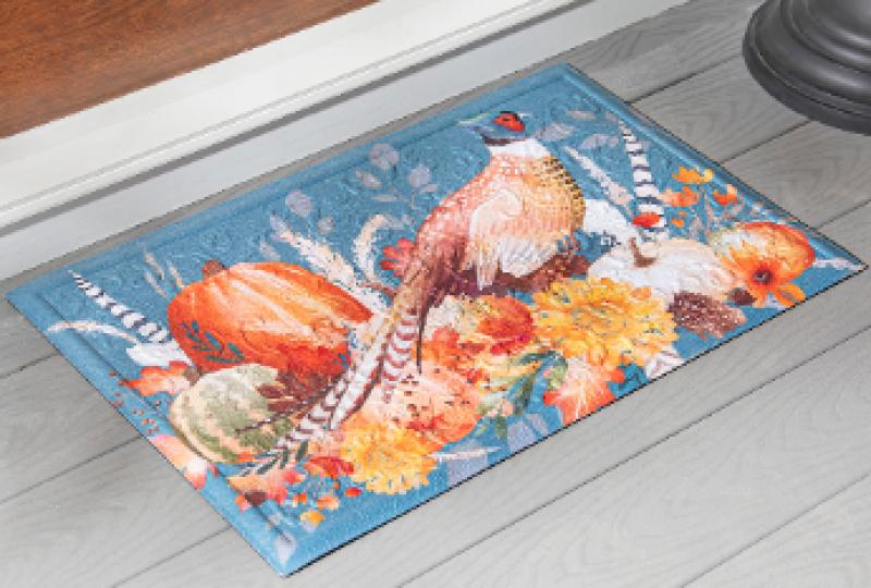Blue & Orange Harvest Pheasant Embossed Floor Mat. Colorful mat with ridges and grooves to trap dirt. 30'' x 18'', 0.5'' thick