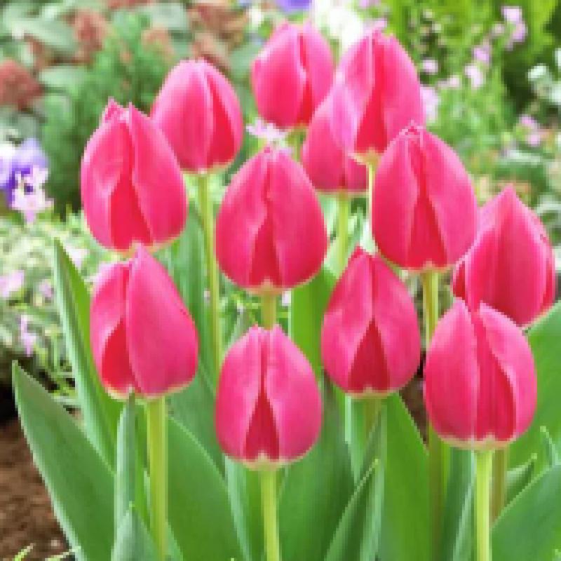 Tulipa x 'Rosy Delight' (Darwin Hybrid Tulip) has large, dark rose-pink colored flowers on strong stems. Intensely colored blooms begin earlier and last longer than other Darwin tulips. 'Rosy Delight' Tulips make excellent cut flowers and are reliably perennial.