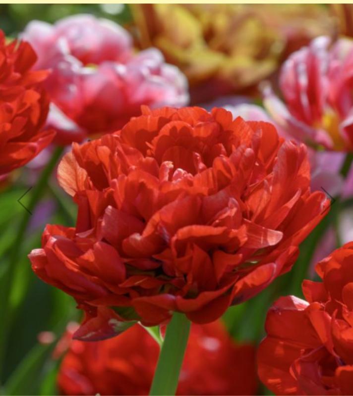 Appearing to erupt into full bloom, these mammoth, fully double, 6"-wide blooms are fire engine-red with variable white highlights and green sepals. Tulip Class: Peony Flowering (Double Late). Bulb size: 12 cm/up. Bloom time: Late April. Horticultural zones 3-7. Plant 6" to 8" deep and 6" apart. Height: 14” to 16”.