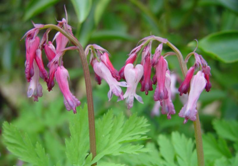 Dicentra species, commonly called Bleeding Hearts, are low-growing, native perennial plants known for their delicate, fern-like foliage and iconic heart-shaped flowers. The most prominent species is the Wild Bleeding Heart (Dicentra eximia), which features pendulous pink to purplish flowers with fringed edges that bloom from spring through summer, attracting pollinators. This adaptable plant thrives in filtered to partial shade and rich, moist, well-drained soil, making it a popular choice for woodland, shade, and naturalized gardens.