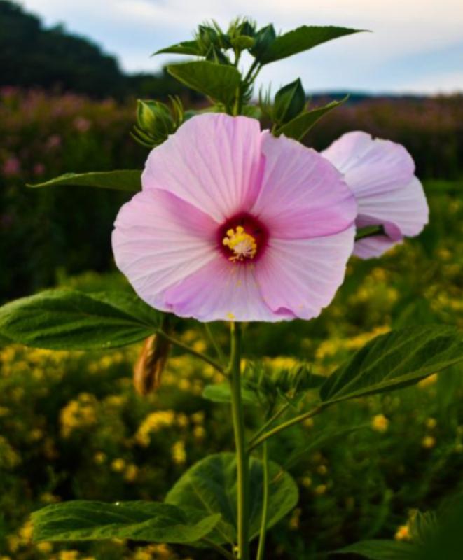 A large, attractive plant suited for sunny, moist, even wet and slightly acidic sites. Multiple stems will come from a single plant on this shrub-like perennial forb. The large leaves are dark gray-green, and hairy on the underside. The stunning white flowers reach 6"-10" across with dark pink centers, and long, cream-colored stamens. Blooms are occasionally light pink. Great for a late-summer living fence, a wetland edge, or rain garden.