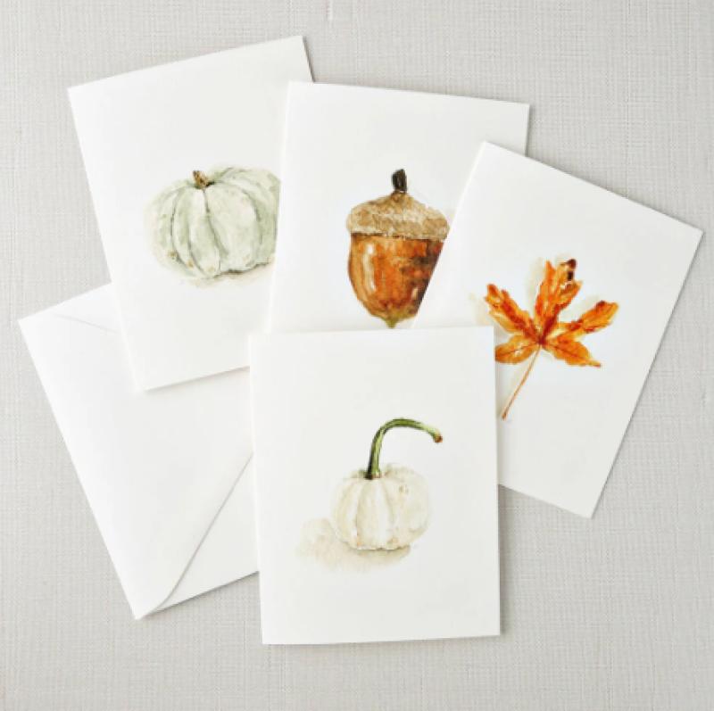 The assorted set of autumn notecards are blank on the inside with charming watercolor illustrations of a maple leaf, acorn, white pumpkin and green pumpkin on the front. They bring a touch of fall delight to your thank you notes, housewarming gifts, get-well wishes, and more. Details: - set of eight folded cards + envelopes, two of each illustration - blank inside - 5.5" x 4.25" - Printed on 120lb superfine paper
