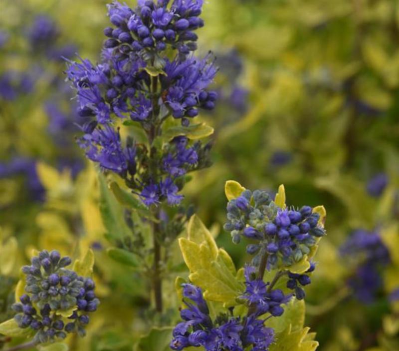 Shows beautiful golden foliage in Spring and Summer, accented by blue flowers in late Summer and Fall.
