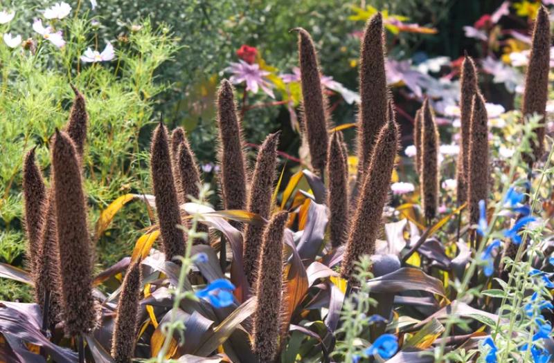 Millet, commonly called pearl millet, is an ornamental plant used to add height and a splash of color to gardens. The plant is leafy with an upright growth habit, producing long, slender deep purple foliage, stems, and flower plumes. Millet grows best in hot climates, but not necessarily humid climates, and requires full sun and moist, neutral soil. If you leave seed heads on the flower spikes to mature and dry out, your backyard birds will feast on the pearl-like seeds, as millet is a popular grain used in birdseed mixes.