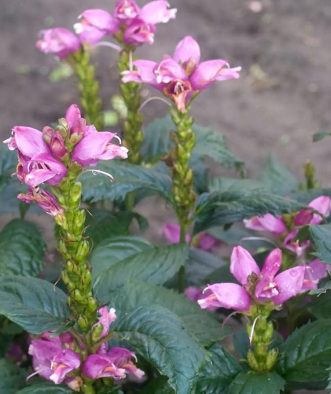 Fascinating snapdragon-like flowers over spreading plants. Blossoms are said to resemble the heads of open mouthed turtles. Rosy-pink flowers provide late-season color that graces the glossy, fine-toothed foliage. Chelone is an ideal plant for the middle of the border. Will provide a nice contrast for dwarf shrubs.