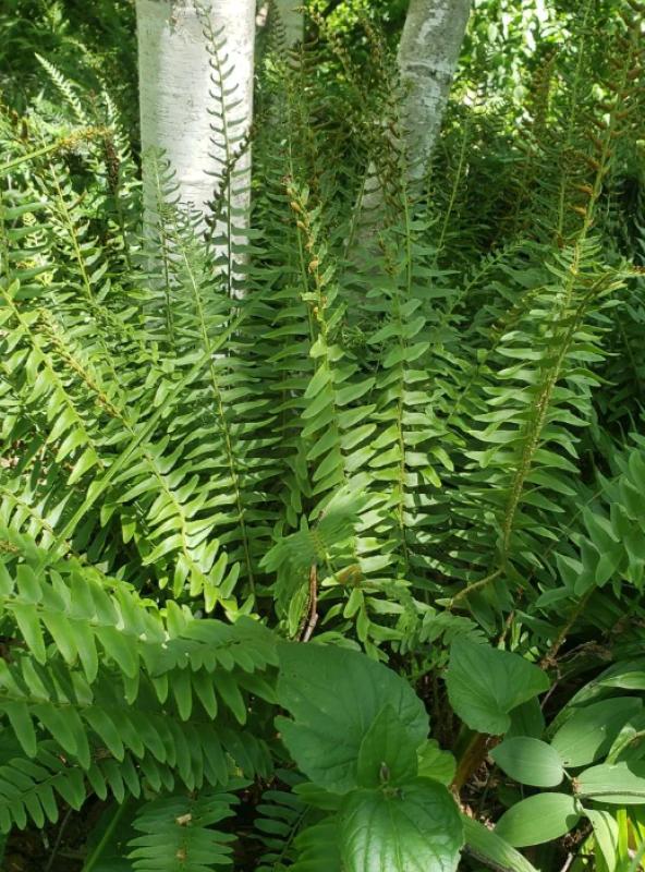 One of the most familiar ferns of eastern North America, Christmas Fern is named for its evergreen fronds. The firm, deep green leaves are a great companion for woodland wildflowers. Shady wooded slopes are its native habitat, and it will thrive in any well-drained soils. Avoid planting it in consistently moist or heavy clay soils, as poorly drained soils can result in crown rot. Resistant to damage from deer, the rhizomatous plants will expand to form a large clump 1 - 2 feet wide, but will not creep or form ground cover. Christmas Fern is jugland tolerant and will grow successfully under walnut trees. Mature plants can be divided in early spring. Mulch with fallen leaves.