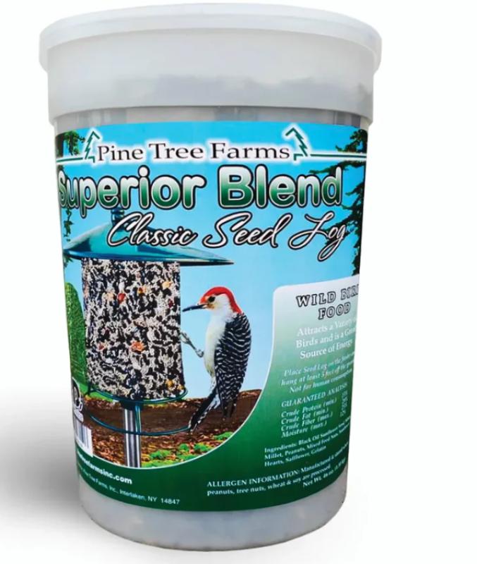 This solid seed log attracts way too many birds. Have fun watching them feed from every angle! Perfect for year-round feeding and won’t melt in hot weather, save on the set of two Superior Blend Classic seed logs. Contains high-energy black oil sunflower seed, peanuts, safflower seed, sunflower hearts, tree nuts and white millet. Serve in your own seed log or seed cylinder feeder, since there's a hole in the center of the log. 6 inch diameter.