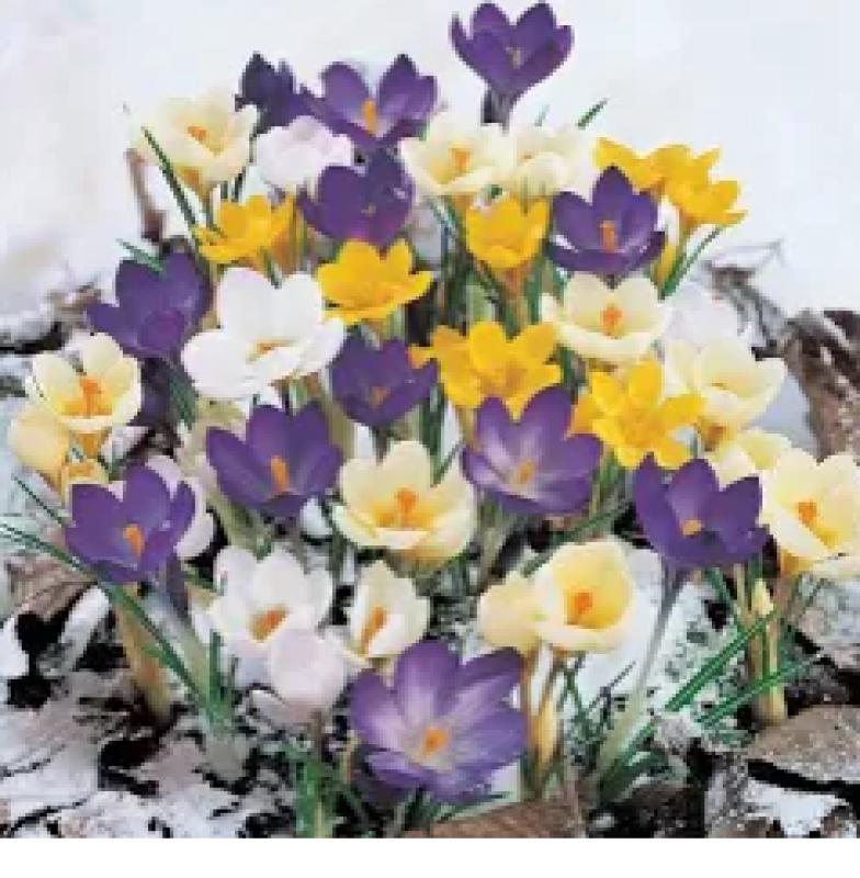 A Snow Crocus Mixture is a blend of very early-blooming crocus varieties, often including white, yellow, blue, and purple colors, that are ideal for naturalizing in lawns and gardens. These low-growing, hardy bulbs typically bloom in late winter or very early spring, even through snow, and should be planted in fall in full sun or partial shade with well-drained soil.
