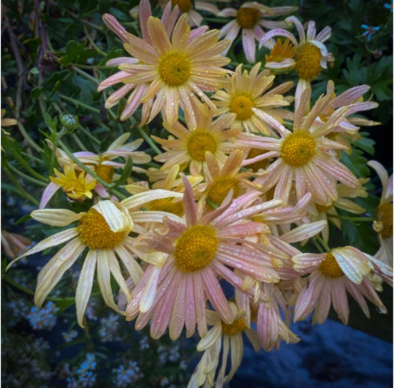 Chrysanthemum 'Brandywine Sunset' is a type of Korean mum, a hardy garden chrysanthemum with large, single, daisy-like flowers that bloom in late summer and fall. Its petals start as orange-red buds, open to a soft yellow, and then develop a pink blush, creating a beautiful "sunset" effect. This plant is known for being attractive to butterflies and bees, is deer resistant, and makes a great addition to borders and beds.