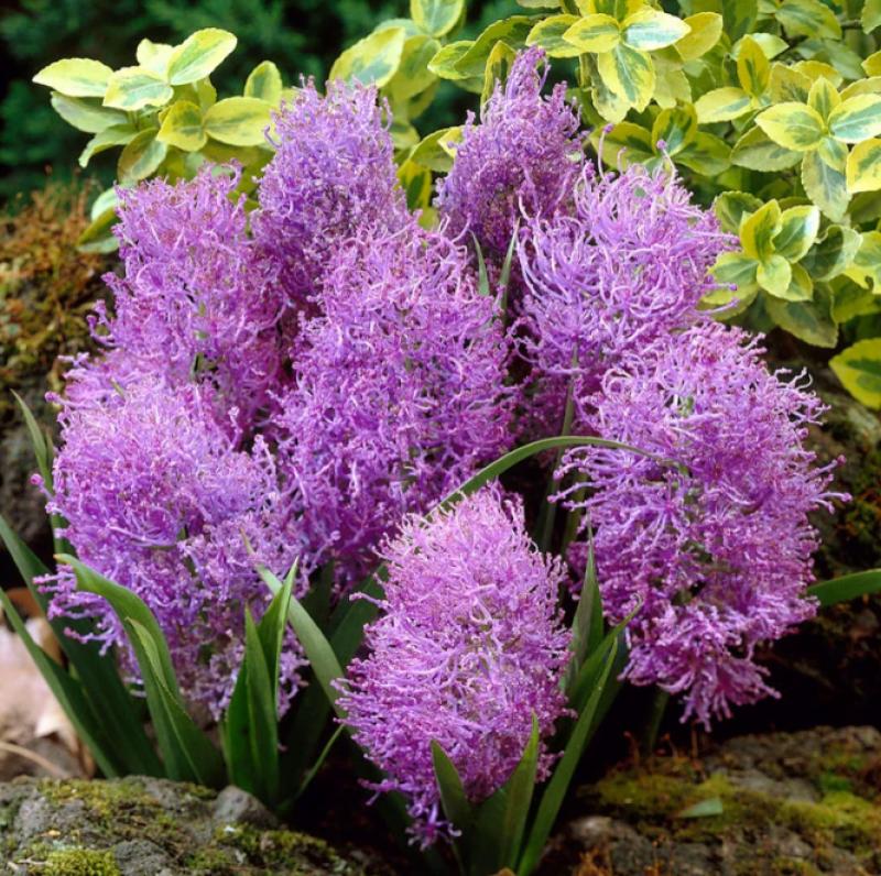 Cotton Candy Grape Hyacinth (Muscari comosum ‘Plumosum’) make a striking statement in the spring garden. Fragrant clouds of frilly lavender-purple blooms add an unusual, but easy-to-grow presence in your garden. At 8-10” tall, and blooming from mid-to-late spring, they are striking when grown along a perennial bed. They also add a bright, fresh look to a border of daffodils and tulips. Cotton Candy are hardy, deer and squirrel resistant flowers that will make your garden shine.