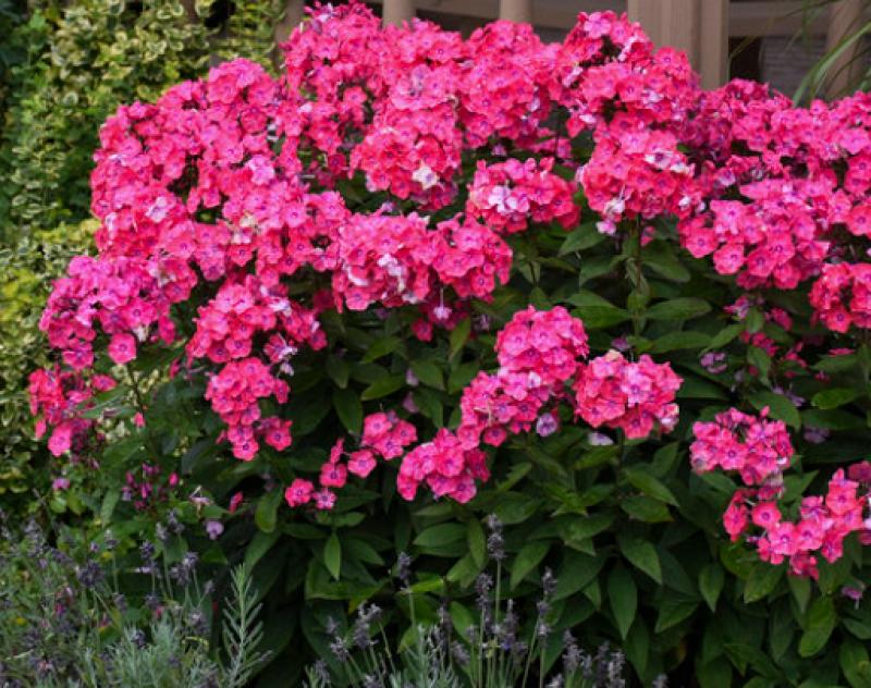 Showy, large clusters of hot coral pink flowers. Bright green foliage is mildew resistant. Excellent rebloom through late summer. Fragrant Flower