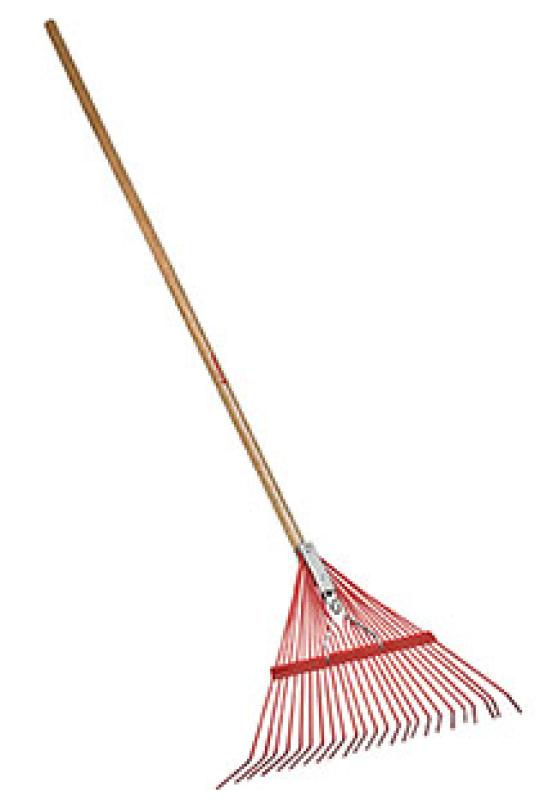 Fan-shaped head combines flexible tines with durability of metal. Stress distribution bar that prevents tines from twisting or breaking when pressed on. Coated frame and tines resist rust. 54" Long wood handle.