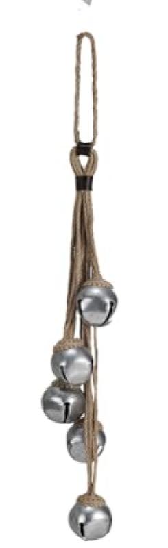 A symphony of silver jingle bells hangs gracefully on a natural jute rope, ready to announce visitors with their cheerful chime. Ideal for adding a musical greeting to the front door, or as a decorative touch to interior doors during the holiday season. Made of shiny metal bells with a silver finish and sturdy jute rope, this door hanger combines elegance with durability