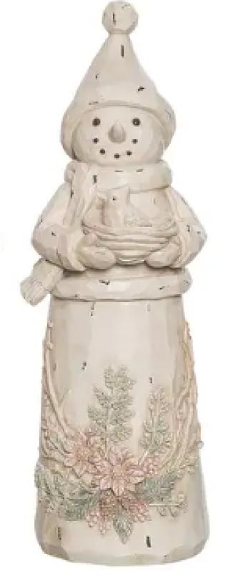 The snowman holds a small woodland friend nestled in a bowl, symbolizing warmth and kindness during the winter season. Subtle touches of pastel greenery and poinsettias accent the base of his robe, adding a gentle pop of festive color while maintaining a natural, rustic aesthetic.