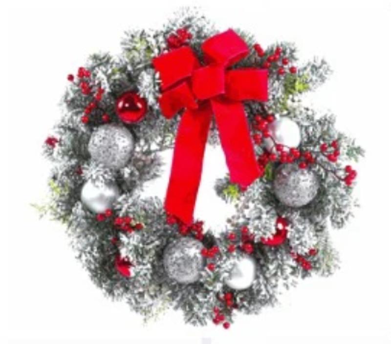 Flocked Wreath With Berries & Ornaments & Red Bow 24"