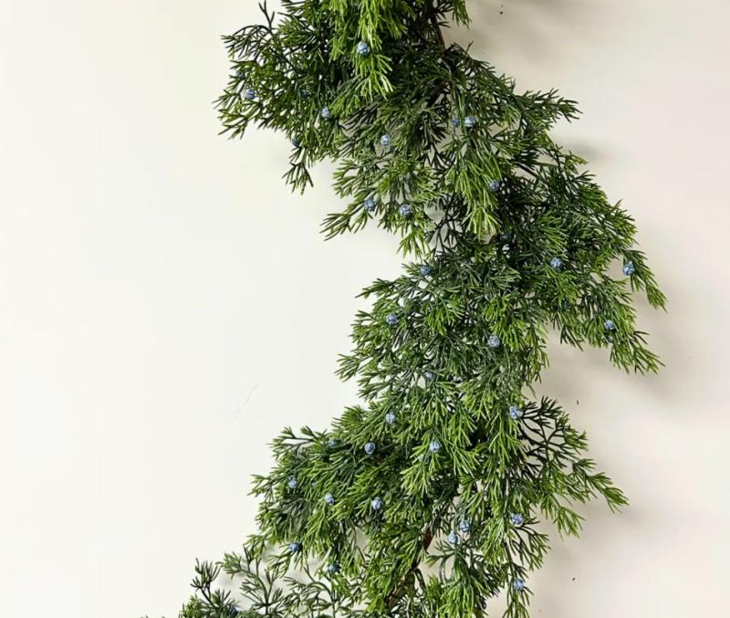 The Juniper Berry Garland, measuring 60 inches, features premium juniper foliage that delivers a rich, natural look ideal for sophisticated holiday decorating. Its expertly crafted design ensures durability and a lifelike appearance, making it perfect for enhancing mantels, staircases, and entryways with timeless greenery.