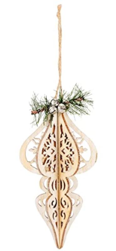 Made of quality MDF material; Measures approximately 6.75 inches tall. Perfect for display on a Christmas tree, ornament stand, or in a hanging holiday arrangement; Makes a wonderful gift for the Christmas lover in your life. Features a wood cut finial ornament topped with a small piece of garland and silver bells; Each wood fin features a snowflake profile and ornate cutout in distressed white; Ornament looks attractive from any angle