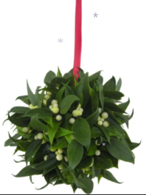 Kissing Ball with faux green laurel leaves, white berries and a red satin ribbon hanger.