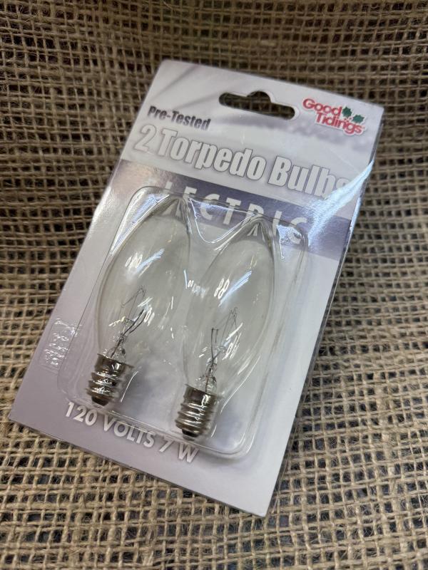 Keep your decorative lighting glowing bright with this 2-pack of Good Tidings Torpedo Bulbs. Each bulb is pre-tested for reliability and features a classic torpedo shape, perfect for holiday décor, night lights, window candles, and other small fixtures.