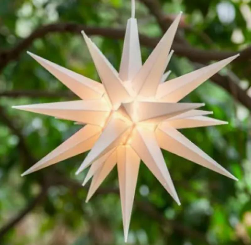 The 21" large white Moravian star has a warm glowing 15w bulb that shines beautifully into the night. The 21" size is perfect as a porch light. Match your white lights with this white star. The product has assembly required - white Moravian star light is prewired. Does not come assembled. Features fast press & clip design for easy assembly. Simple directions with excellent pictures. This white Moravian star light, classic shape design spreads holiday cheer & tradition, meant to symbolize the star of Bethlehem.