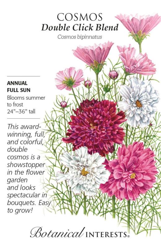 Double Click Blend Cosmos produces large, fully double blooms in a mix of soft pinks, whites, and rose tones, creating a lush, romantic garden display. Its tall, graceful stems and feathery foliage make it ideal for borders and fresh-cut flower arrangements. Easy to grow in full sun, this variety blooms generously from early summer until frost while attracting pollinators.