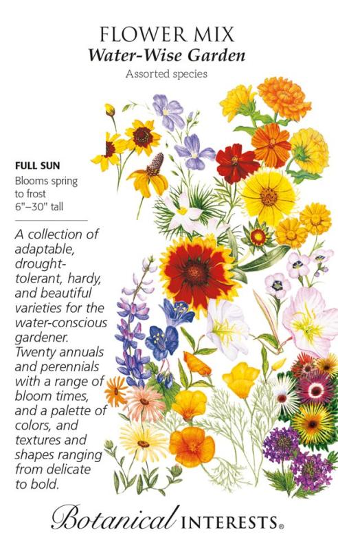 Specifically designed for water-wise gardens that conserve water and reduce maintenance while supporting pollinators. Mix includes Bird's Eyes, Gaillardia, Blue Flax, California Bluebell, Dwarf Yellow California Poppy, Orange California Poppy, Dwarf Plains Coreopsis, Sulphur Cosmos, African Daisy, Desert Marigold, Iceplant, Pixie Delight Lupine, Mexican Hat, Moss Verbena, Mountain Phlox, Pink Evening Primrose, White Evening Primrose, Calendula, and Tidytips. Plant heights range from 4-36 inches. All varieties have been selected for drought tolerance and adaptability. Mix displays approximately 15 different flower colors and blooms throughout most of the summer.