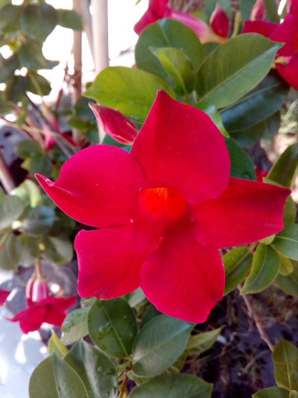 Dipladenia is a compact, tropical flowering plant known for its glossy green foliage and abundant, trumpet-shaped blooms in vibrant shades of red, pink, or white. Its tidy, bushy habit makes it ideal for containers, hanging baskets, and patio displays. Heat tolerant and easy to care for, it provides long-lasting color throughout the warm season.